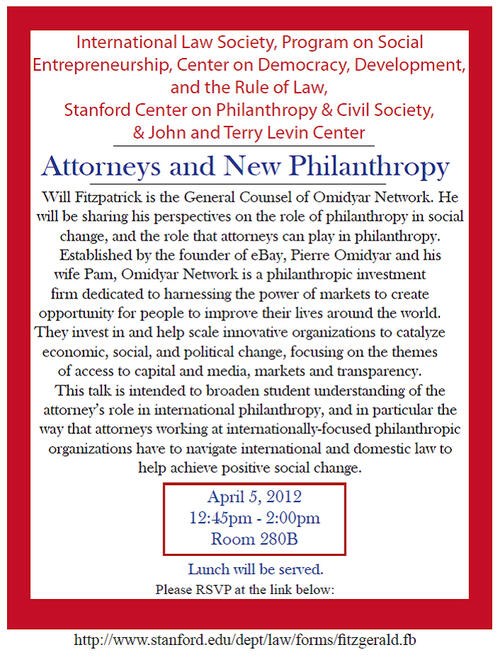 Will Fitzpatrick is the General Counsel of Omidyar Network. He will be sharing his perspectives on the role of philanthropy in social change, and the role that attorneys can play in philanthropy. Established by the founder of eBay, Pierre Omidyar and his wife Pam, Omidyar Network is a philanthropic investment firm dedicated to harnessing the power of markets to create opportunity for people to improve their lives around the world. They invest in and help scale innovative organizations to catalyze economic, social, and political change, focusing on the themes of access to capital and media, markets and transparency. This talk is intended to broaden student understanding of the attorney's role in international philanthropy, and in particular the way that attorneys working at internationally-focused philanthropic organizations have to navigate international and domestic law to achieve positive social change.